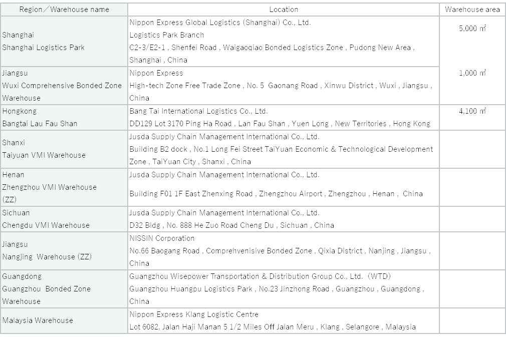 - Each group company had been individually employing warehouses and logistics providers located in different parts of China. We reorganized the distribution base network and consolidated each warehouse into the Shanghai and Wuxi areas. We have greatly strengthened our global supply chain supporting system.